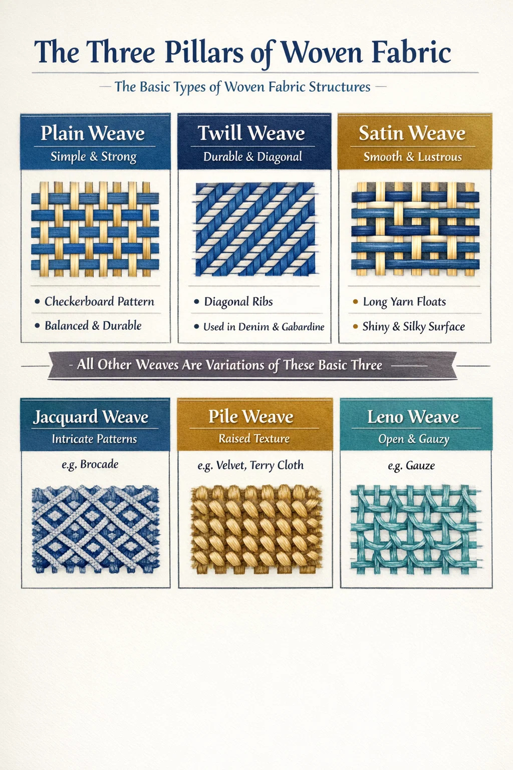Walaupun terdapat beratus-ratus nama pasaran khusus untuk tekstil, terdapat secara teknikal tiga jenis asas fabrik tenunan struktur yang hampir semua yang lain diperolehi: Tenunan biasa, Tenunan Twill, dan Tenunan Satin . Setiap variasi lain, seperti tenunan Jacquard, Dobby, atau longgokan, ialah pengubahsuaian kompleks bagi tiga corak jalinan asas ini. Memahami kategori ini adalah penting untuk mengenal pasti ketahanan, langsir dan kegunaan mana-mana produk tekstil.