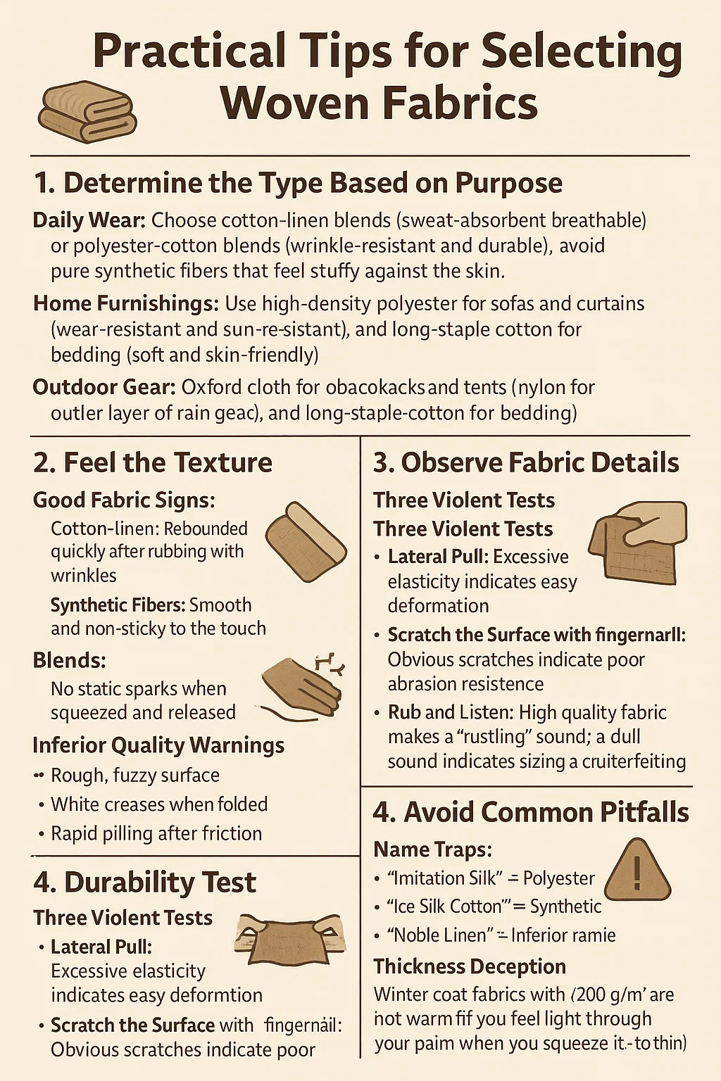 Pakaian harian: Pilih campuran kapas-linen (penyerap peluh dan bernafas) atau campuran poliester-kapton (tahan keriput dan tahan lama), mengelakkan gentian sintetik tulen yang merasa tersumbat terhadap kulit.