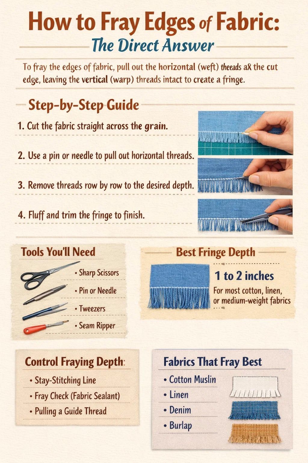 | Fraying | Kasual, bohemian, desa | Hiasan, denim, linen, kraf | Sederhana (needs maintenance) |