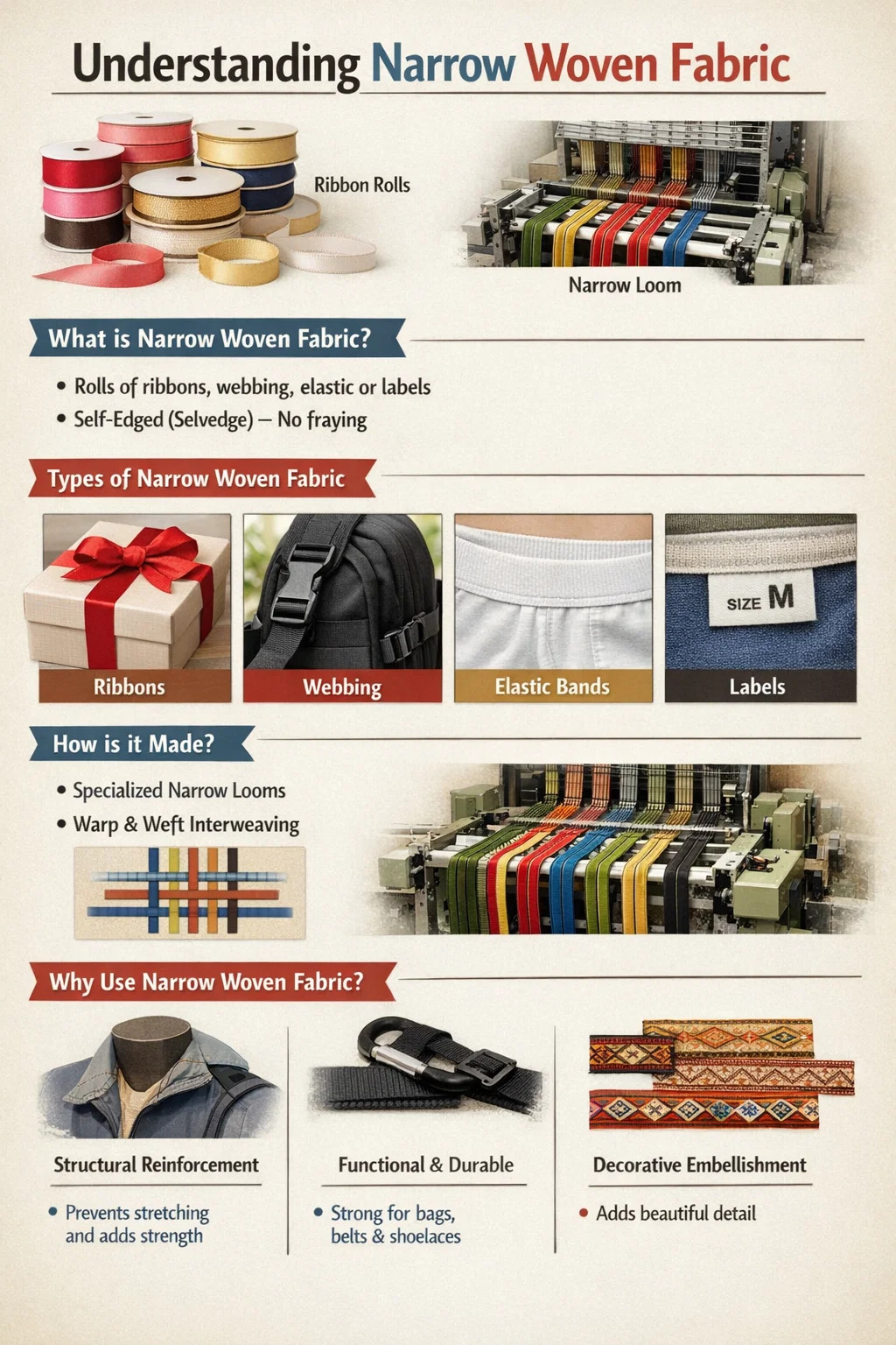 We often see different forms of narrow woven fabric in our daily lives: