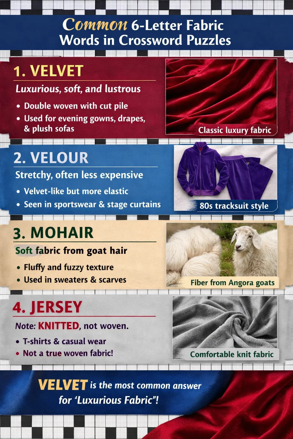 Dalam teka silang kata, jika petunjuk menerangkan 6 huruf "mewah, lembut dan baldu" kain tenunan , jawapan paling klasik ialah VELVET.