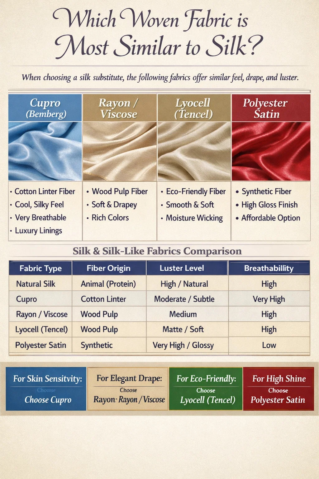 Apabila mencari a kain tenunan yang meniru rasa mewah, kilauan, dan tirai sutera semula jadi, pesaing yang paling menonjol ialah Rayon, Cupro dan Lyocell (Tencel) . Antaranya, Cupro secara meluas dianggap sebagai perlawanan terdekat dari segi kebolehnafasan dan sentuhan sutera, manakala Poliester tenunan satin berfungsi sebagai alternatif sintetik mampu milik yang paling biasa. Kain ini menggunakan khusus menganyam teknik untuk meniru gentian protein licin yang dihasilkan oleh ulat sutera.